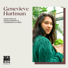 Have you ever wondered about the staff members that keep BOA running? Well, wonder no more! We’ve created a short interview series so you can get to know the BOA staff. Check out this interview with Genevieve Hartman (She/Her), BOA’s Director of Development & Communications. BOA: Hi Gena! Tell us about your role at BOA! Gena: I’m the Director of Development & Communications. I write grants and manage the social media, handle community outreach and book donations, and organize our yearly fundraiser, Dine & Rhyme. If you send BOA a message on Instagram, Facebook, or Twitter, you'll usually hear back...
